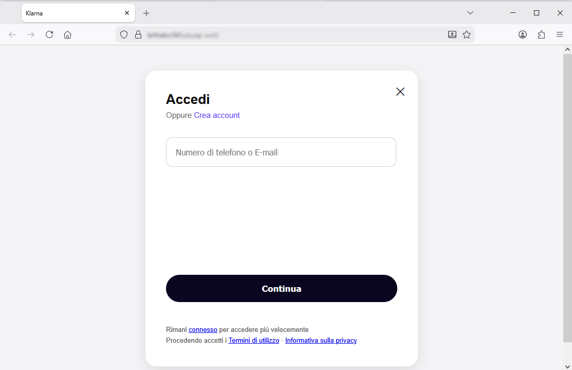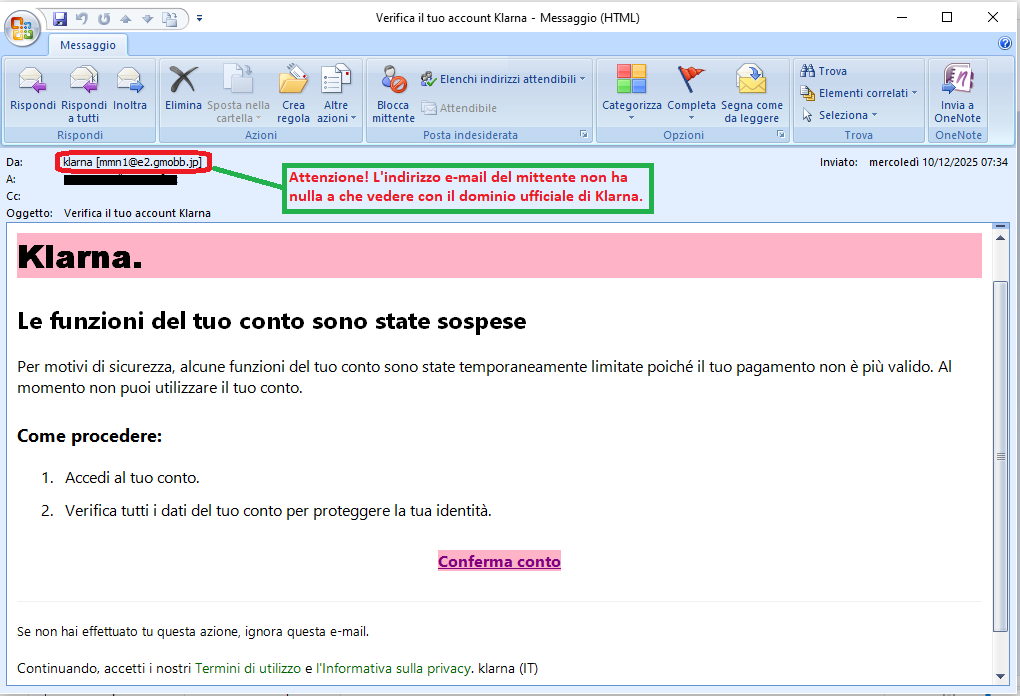 Klarna, notiamo che l’indirizzo/dominio è anomalo: