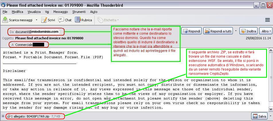 L'archivio ZIP allegato alla e-mail una volta scompattato renderà disponibile un file .WSF che una volta eseguito, si porrà in esecuzione automatica di Windows procedendo cosi a contattare un server remoto dal quale scaricherà ed eseguirà una nuova variante CryptoZepto.