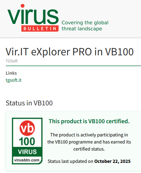 TG Soft Cyber Security Specialist, italian company distributor for more than 30 years of AntiVirus-AntiSpyware-AntiMalware and AntiRansomware Crypto-Malware protection solutions, participated in several Virus Bulletin meetings, where more than 400 delegates from all over the world were present, to share their ideas, expertise and research; at VB2019London, at VB2018Montreal; at VB2017Madrid; at VB2016Denver; at VB2015Praga; and at VB2011Barcellona.