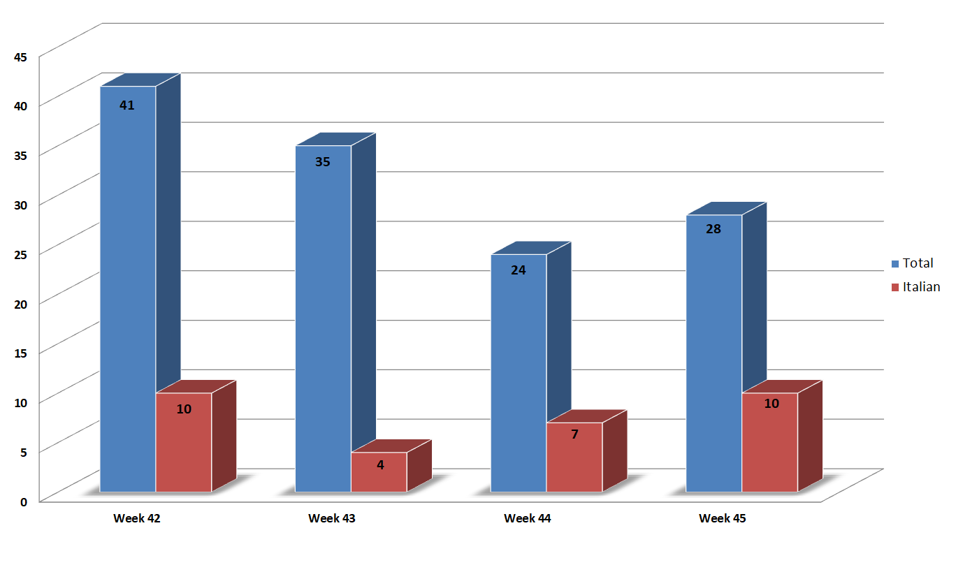 During the week, the peak in global campaigns was recorded on Tuesday, 04 November, with nine different campaigns per day. The peak in campaigns  in Italian was recorded on Thursday, 06 November, with four campaigns per day, as shown in the graph below: