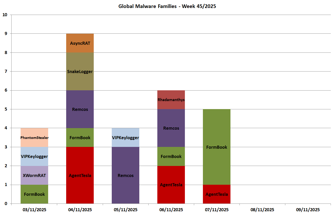 Malware spread through the campaigns: AgentTesla, AsyncRAT, FormBook, Remcos