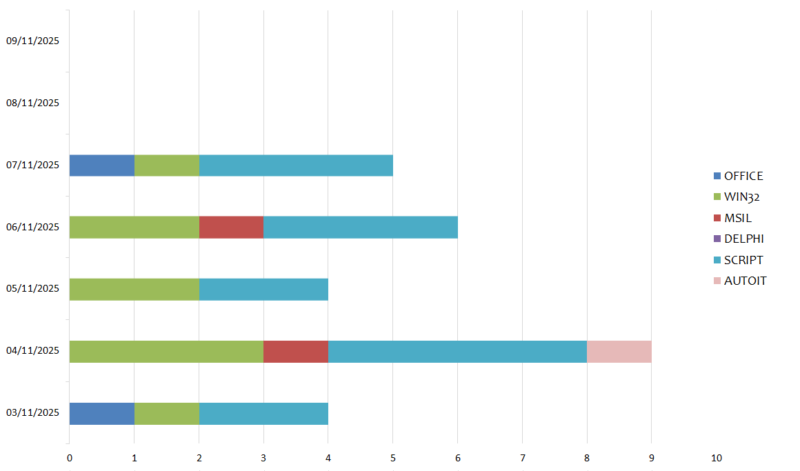 Instead in this graph we see the distribution based on malware family. In the past week 9 different families were detected: