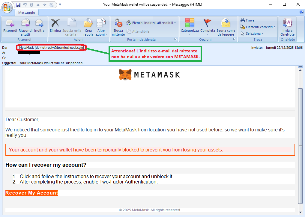 MetaMask account from a device never used before. It then warns him/her that his/her account and wallet have been temporarily blocked to prevent the loss of funds.