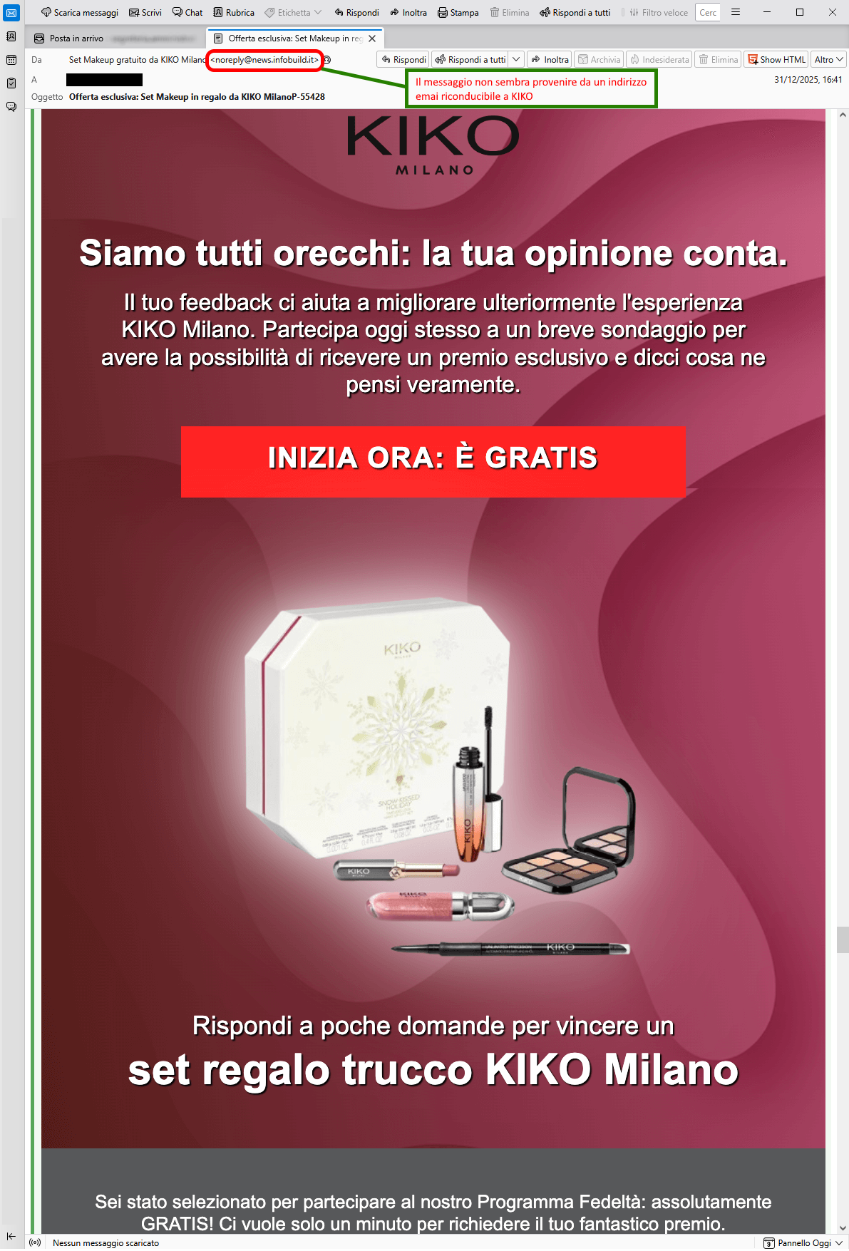 comunicazioni(at)*******> that seems to belong to the recipient's email domain. This is definitely unusual and should make us suspicious.