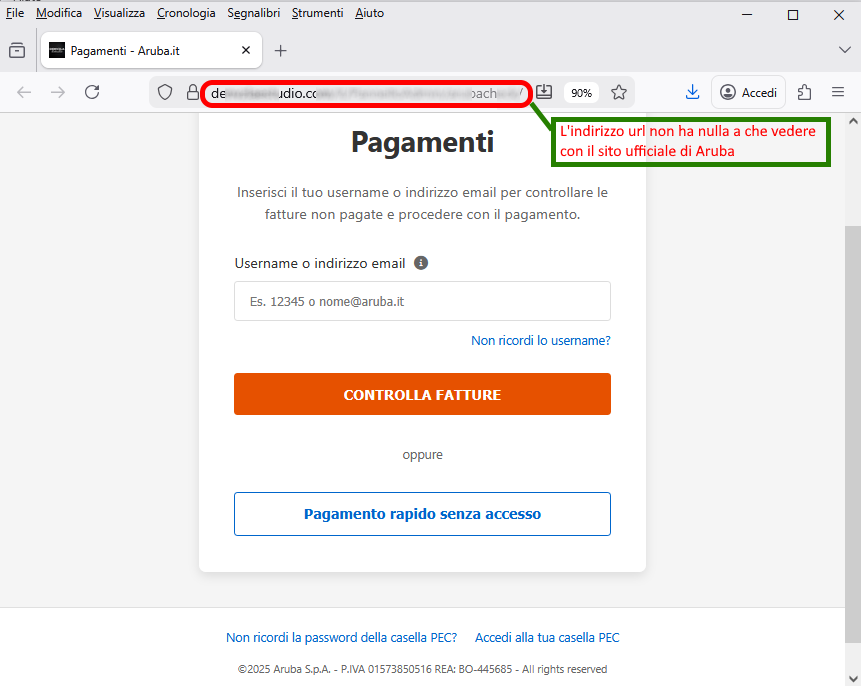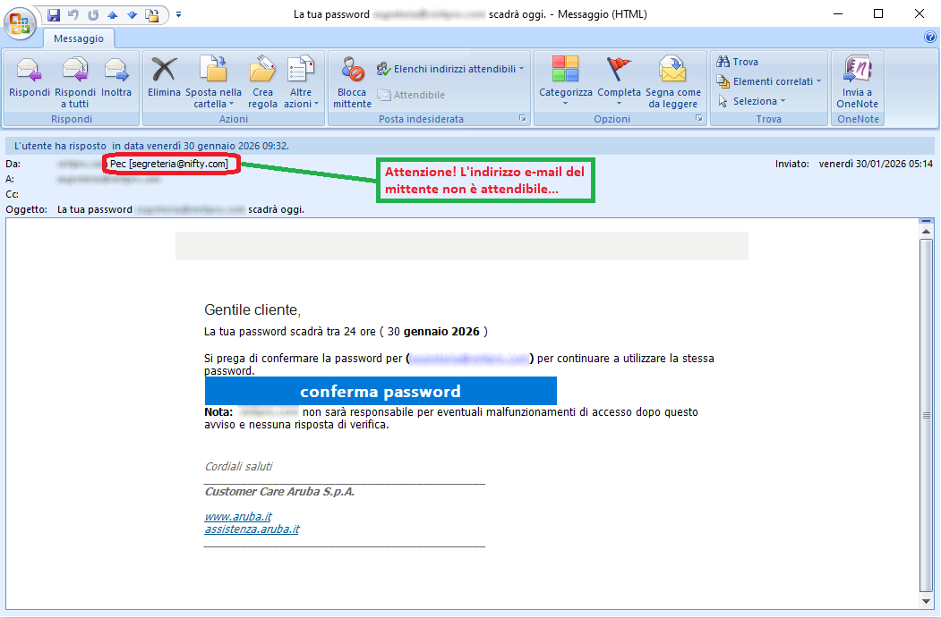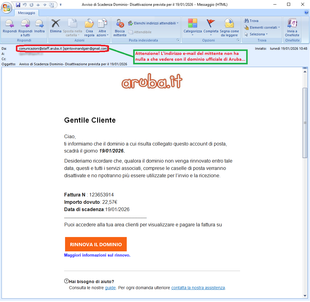 Aruba, the well-known web hosting, email and domain registration company, is clearly not involved in the mass sending of these emails, which are genuine scams whose aim, as always, is to steal sensitive data from unsuspecting recipients.