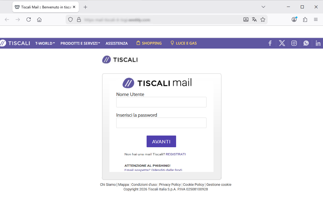 TISCALI account login page – as the cybercriminal had the foresight to insert the logo – is not at all reliable. In this case too, the address is abnormal: