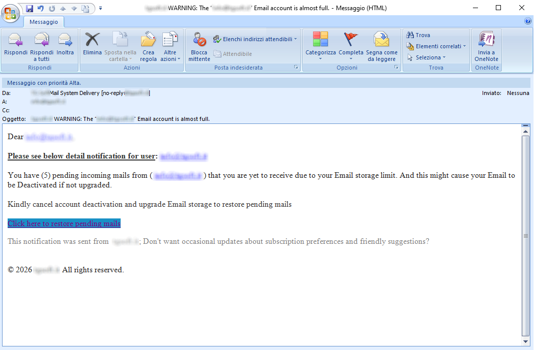 The message, in English, informs the recipient that he/she has 5 new pending messages, which he/she cannot receive because he/she does not have enough storage space. If he/she does not upgrade his/her storage space, he/she may risk account deactivation, in addition to losing the pending emails. The following link is provided to upgrade storage space: