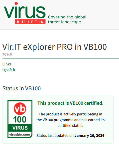 TG Soft Cyber Security Specialist, italian company distributor for more than 30 years of AntiVirus-AntiSpyware-AntiMalware and AntiRansomware Crypto-Malware protection solutions, participated in several Virus Bulletin meetings, where more than 400 delegates from all over the world were present, to share their ideas, expertise and research; at VB2019London, at VB2018Montreal; at VB2017Madrid; at VB2016Denver; at VB2015Praga; and at VB2011Barcellona.