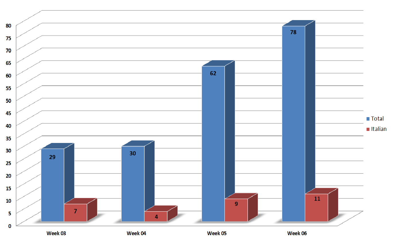 The blue bar shows the total number of campaigns monitored in Italy in each week, while the red bar concerns campaigns in Italian (and targeting Italy).