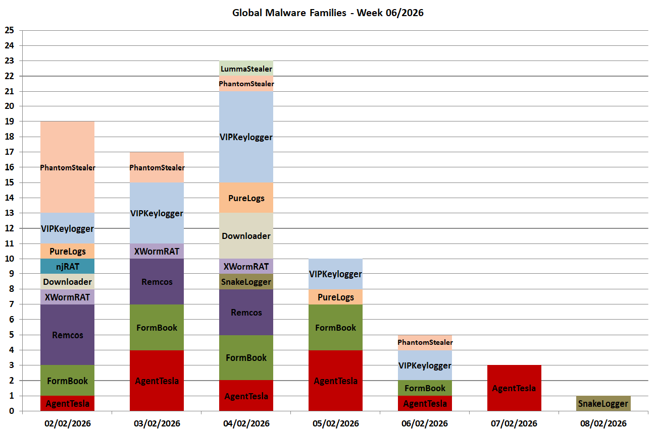 AgentTesla, Downloader, Phantom Stealer, Remcos and VIPKeylogger.