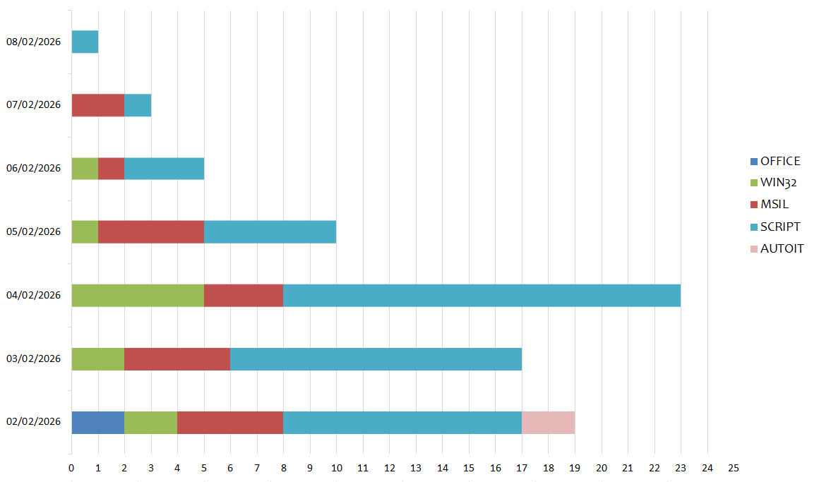 Instead in this graph we see the distribution based on malware family. In the past week 11 different families were detected: