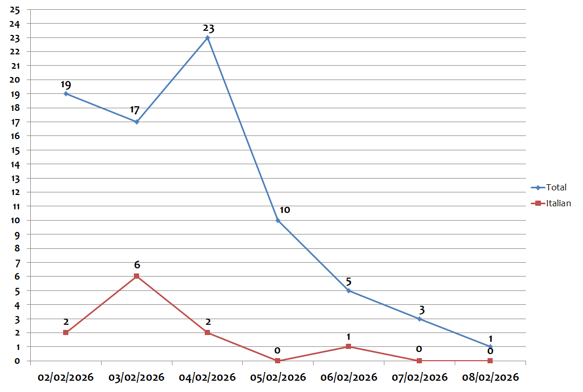 During the week, the peak of global campaigns was recorded on Wednesday, February  04, with 23 different campaigns per day. The peak of campaigns written in Italian was recorded on Tuesday, February 03, with 6 different campaigns per day, as shown in the graph below: