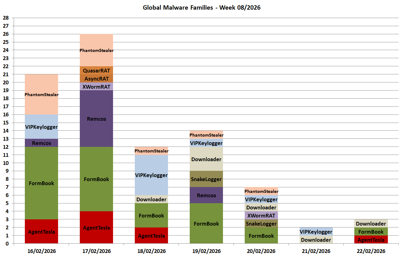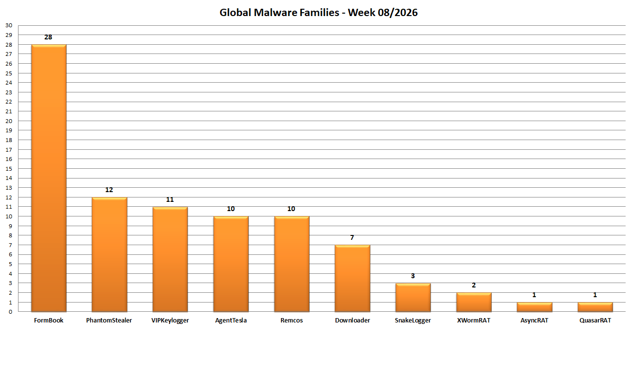AgentTesla, FormBook, PhantomStealer, QuasarRAT, Remcos and VIPKeylogger.