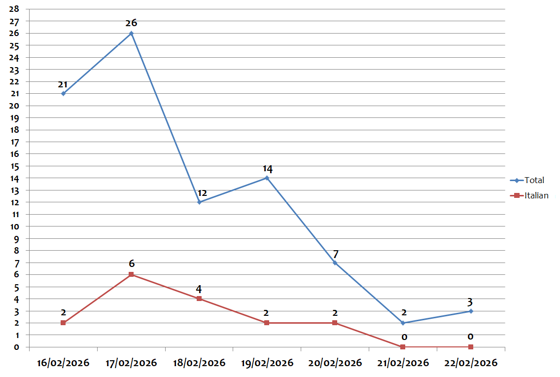 During the week, the peak of global campaigns was recorded on Tuesday, 17 February, with 26 different campaigns per day. The peak of campaigns in Italian was recorded on Tuesday, 17 February, with 6 different campaigns per day, as shown in the graph below: