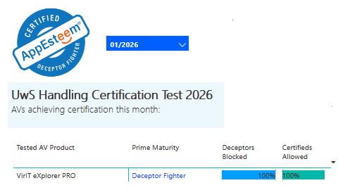 Vir.IT eXplorer PRO passes the latest test performed in January 2026 by AppEsteem for DeceptorFighters AV products, achieving the highest result