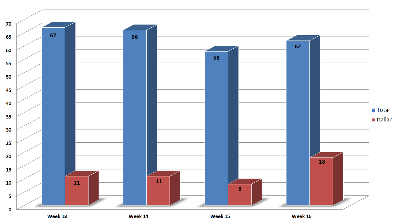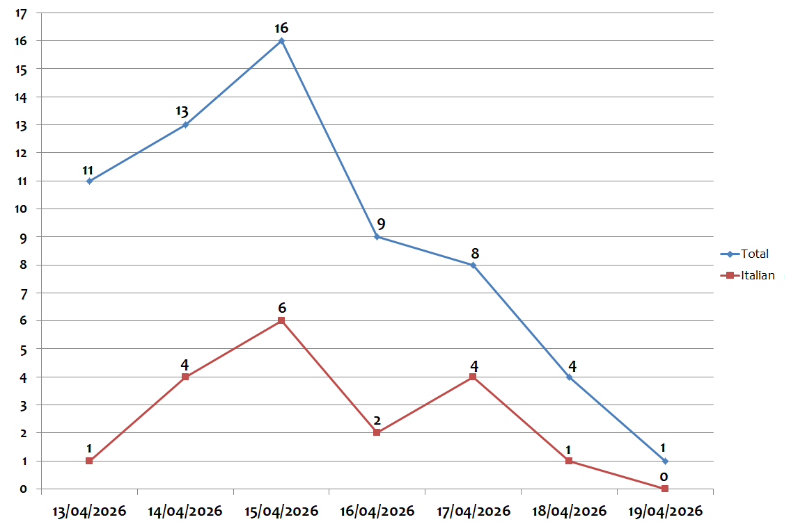 During the week, the peak number of global campaigns was recorded on Wednesday 15 April, with 16 different campaigns per day. The peak number of campaigns in Italian was recorded on Wednesday 15 April, with 6 different campaigns, as shown in the graph below: