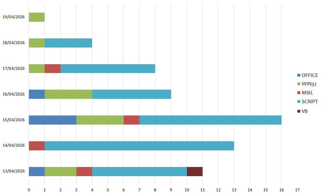 Instead in this graph we see the distribution based on malware family. In the past week 10 different families were detected: